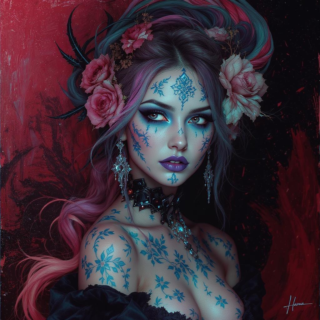 A futuristic fantasy portrait of a tattoo artist adorned with intricate blue tattoos and flourishing flowers on her skin, emanating an intense gaze. Styled in a blend of oil portraiture and digital manipulation, with light red and teal hues. Drawing inspiration from the evocative works of Tanya Shatseva and Daniel F. Gerhartz, the setting combines elements of rococo portraiture with a dark, explosive edge. Posed in a stylized photo shoot, the composition features a tattooed girl against a backdrop of dark pink and light blue, creating a rich tapestry of intricate imagery. The high-resolution image captures the allure and mystery of her persona, blending traditional and modern aesthetics for a captivating visual experience.