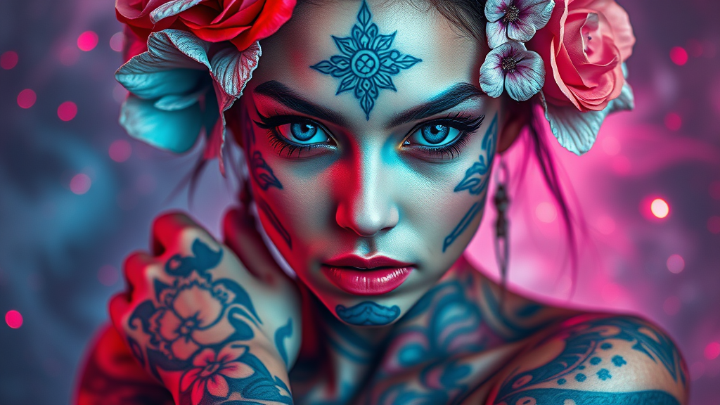 A futuristic fantasy tattoo artist with vivid blue tattoos and ethereal flowers adorning her skin, captured in an intense gaze. The portrait embodies a fusion of oil portraiture traditions and rococo elegance, rendered in high resolution with a palette of light red and teal. The setting exudes a dark and explosive energy, where the tattooed girl poses confidently during a photo shoot. This piece echoes the styles of Tanya Shatseva and Daniel F. Gerhartz, merging dark pink and light blue hues to create an intricate and mesmerizing visual. The imagery is detailed and immersive, with an emphasis on UHD oil portraiture aesthetics, encapsulating a sense of modern mystique and imaginative allure.