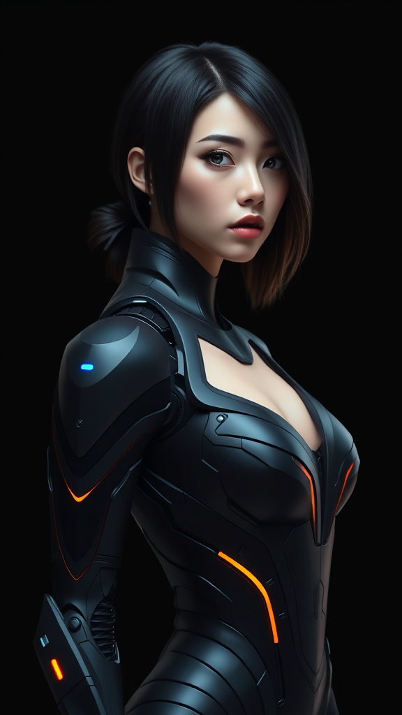 A futuristic female android with smooth, sleek armor featuring glowing accents, her uncovered laid-back black hair cascading around her shoulders. The design embraces dark tones and muted colors, creating a striking high-contrast effect. Her form is captured in hyperrealism under a soft blue-orange spotlight against a black backdrop. The focus is on elegance and sophistication, subtly integrated into her design without flaws or imperfections, maintaining an atmosphere of technological beauty and modern artistry.
