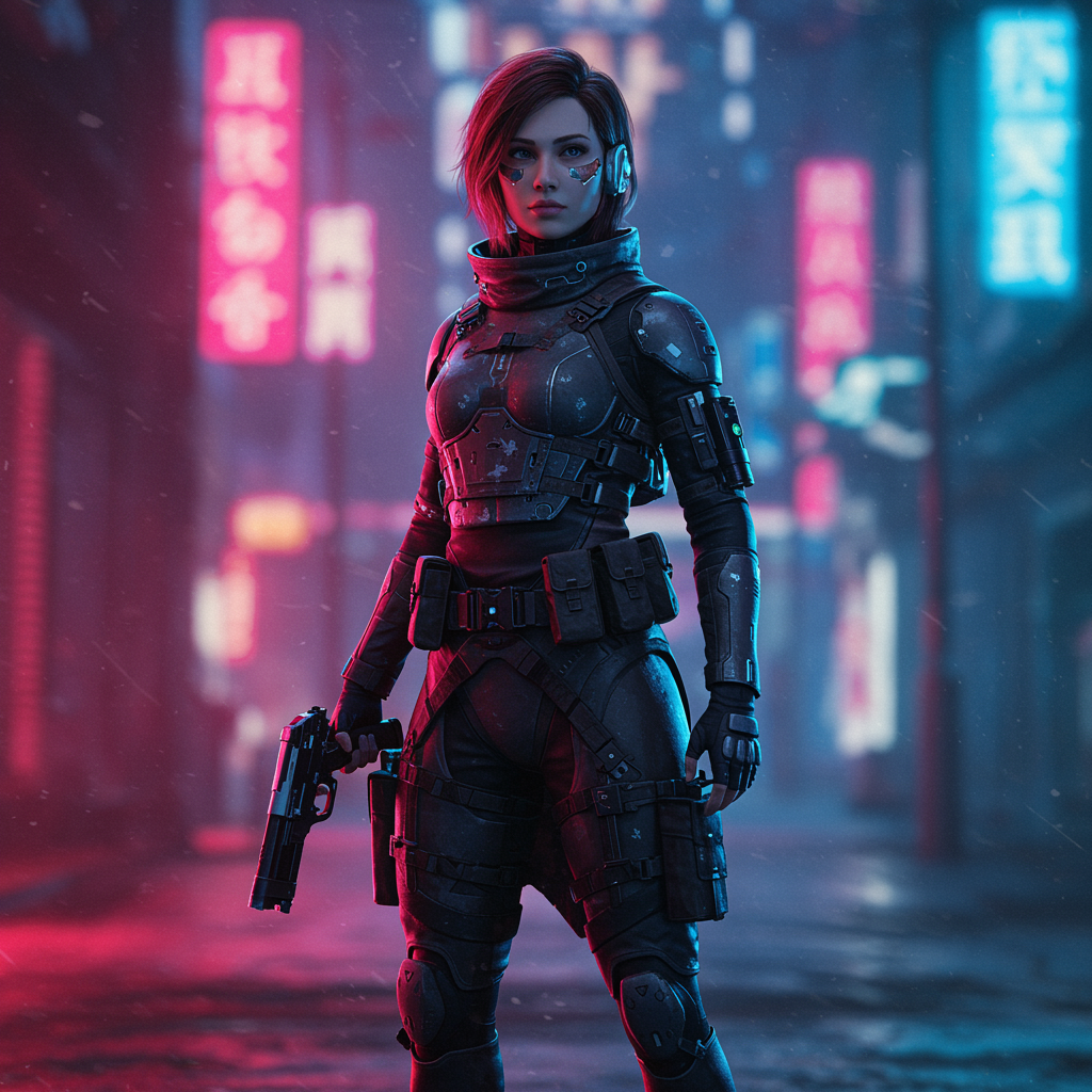 A futuristic female bounty hunter stands poised in a neon-lit urban landscape, her sleek armor gleaming under the dramatic lighting. The setting is vividly captured with high detail and rich colors, reminiscent of a high-resolution RAW color photo. The hyperrealism is accentuated through ultra high resolution, textured details, and physics-based rendering. A sense of realism pervades the scene, with a cinematic feel achieved by using a f1.6 lens, similar to a cinestill 800 film effect. The vibrant and contrasting colors bring a dynamic energy to the image. Her focused expression and poised stance underline her expertise and determination. The environment is tinged with sci-fi elements, highlighting a blend of modern technology and gritty urban aesthetics. The image embodies a perfect balance between reality and imagination, creating an immersive experience.