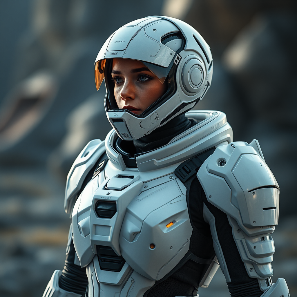 A futuristic female character wearing intricately detailed white sci-fi armor, featuring a cybernetic helmet and a bald head, standing outdoors in a photorealistic setting. Her full armor appears insulated and seamlessly designed, resembling a spacesuit from a high-end sci-fi movie. Captured in natural light, the scene evokes a cinematic quality, enhanced by moody, yet dramatic lighting. The photograph employs a third-person perspective with a blur effect and long exposure for dynamic composition. The highest quality and detail are emphasized, rendered using 8K Ultra-HD clarity with cinematic and ray-traced lighting. The ambiance has a realistic and immersive feel, reflecting a balance of cutting-edge technology and artistry.