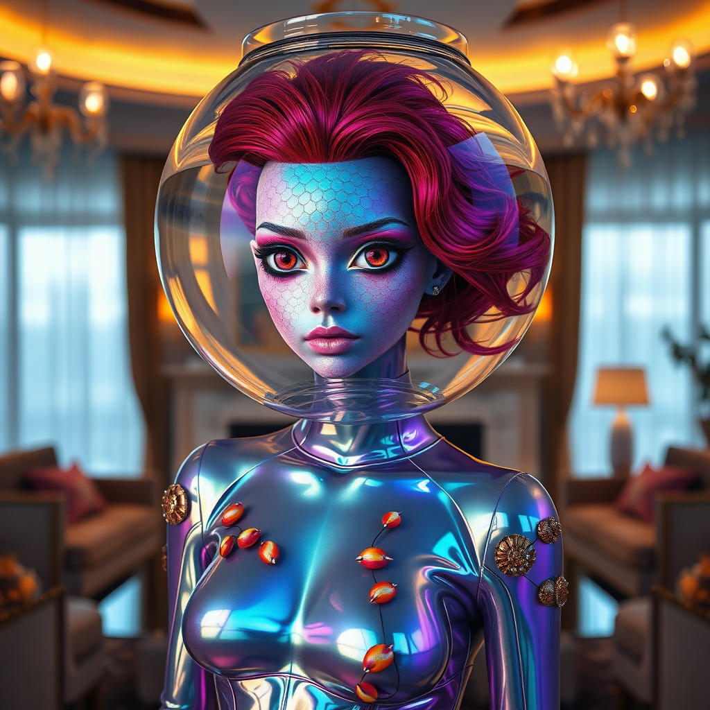 A futuristic female humanoid with iridescent scales and enormous, expressive eyes peers from within a glass fishbowl that encases her head. Her hair undulates gracefully, suspended as if underwater. She stands in an opulently designed living room, wearing avant-garde clothing crafted from glossy plastic and sleek latex that shimmer under the ambient light. Her body is adorned with vibrant algae and small mollusks, creating a surreal fusion of nature and technology. Asymmetric techno ornaments embellish her limbs, catching the eye with their intricate patterns and metallic sheen. The scene is captured in high-resolution, offering a cinematic view inspired by the bold and innovative style of Maya Hansen, set against a backdrop of modern luxury, enhancing the otherworldly yet elegant aesthetic.