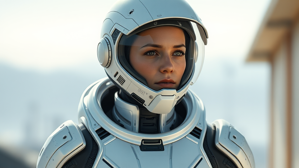 A futuristic female in white sci-fi armor stands confidently, her cybernetic helmet seamlessly integrated with her full insulated spacesuit. Her bald head subtly visible beneath the even surface of the helmet. The armor is intricately detailed, showcasing fine engravings that catch the natural light in a way that highlights its futuristic design. Captured in an outdoor setting, the scene exudes a cinematic and photorealistic quality reminiscent of a sci-fi movie, with the background expertly blurred to accentuate the figure's prominence. Ray tracing techniques enhance the reflective surfaces of the armor, casting realistic shadows and adding depth. This high-quality image is taken from a third-person perspective, emphasizing the character's imposing presence and the masterpiece of her design.