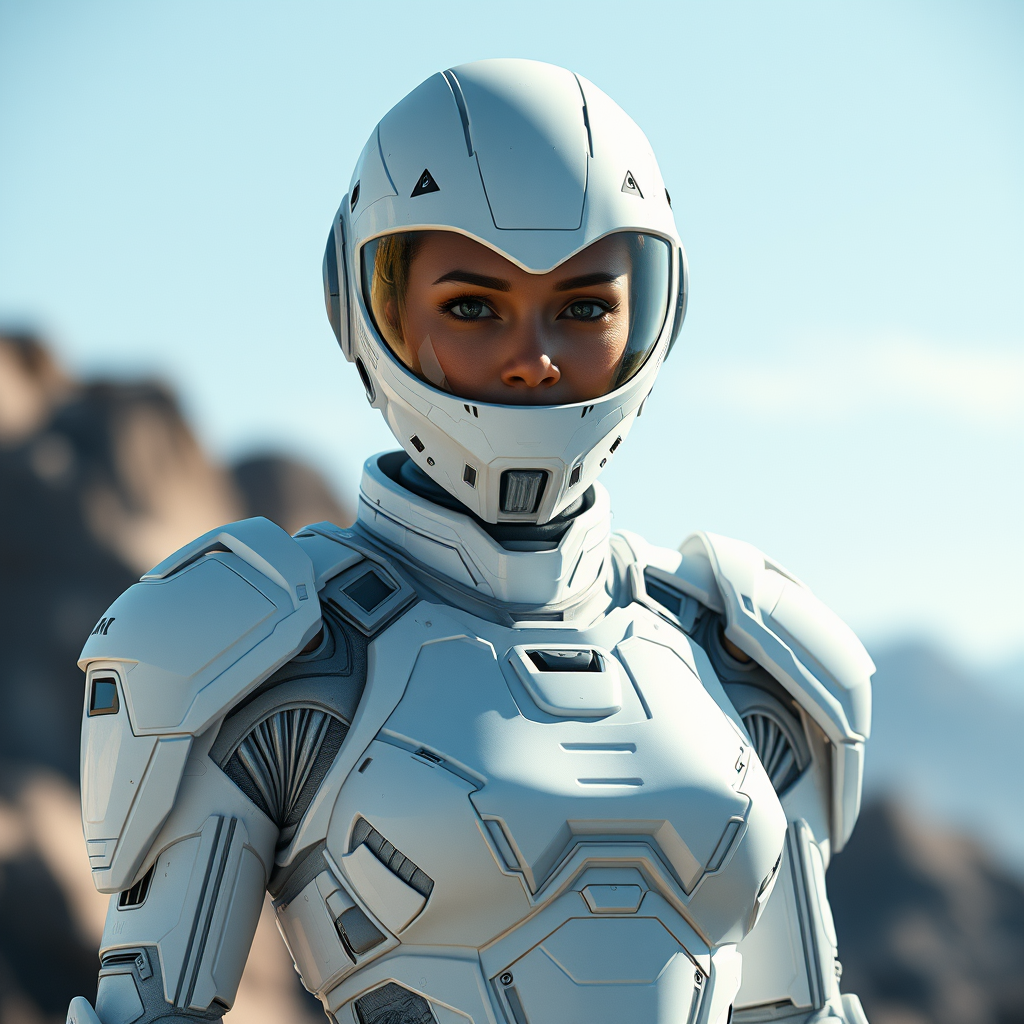A futuristic female warrior clad in intricate white sci-fi armor stands confidently, her sleek, cybernetic helmet reflecting the brilliance of a distant star. The full-body, insulated spacesuit hugs her form with precision, designed for the rigors of alien worlds. Her bald head enhances her streamlined appearance, accentuating the exquisite fine detailing etched across her armor. Captured in an outdoor setting, the photograph employs natural light to highlight the cinematic and photorealistic qualities, utilizing advanced ray tracing techniques. The scene evokes a feeling of awe, as if stepping into a high-budget sci-fi movie. With a third-person perspective, the image is rendered with the utmost quality and detail, carrying a timeless, cinematic essence.