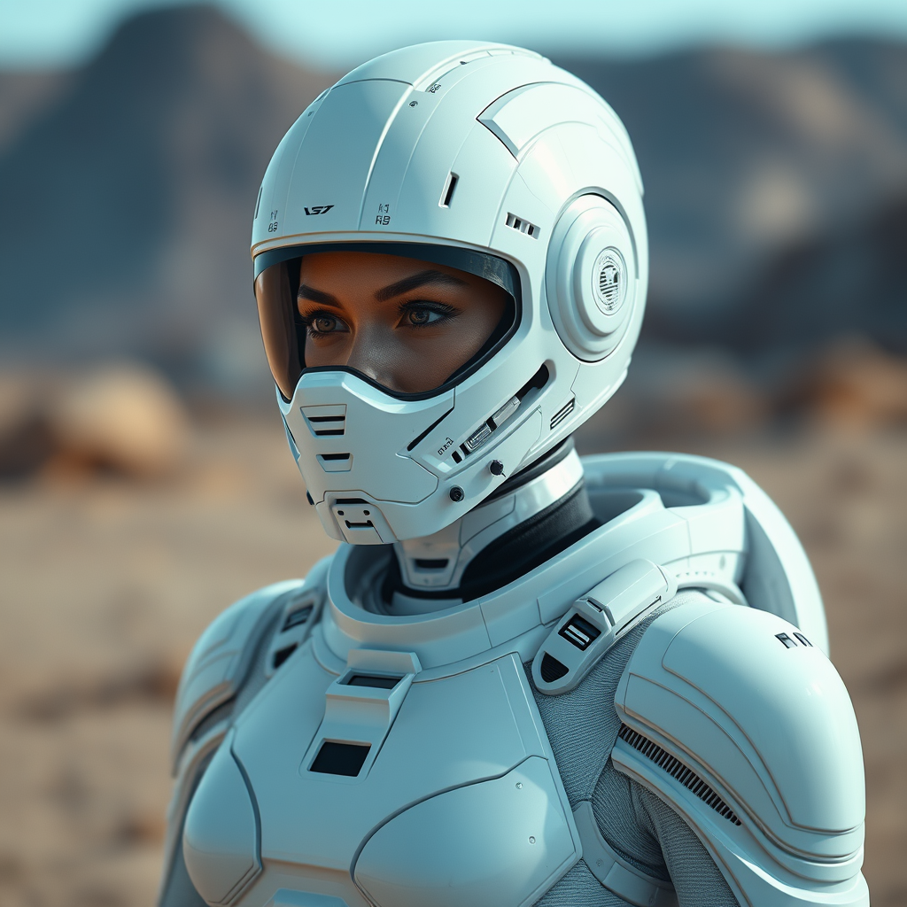 A futuristic female warrior clad in sleek white sci-fi armor stands confidently in an extraterrestrial landscape. Her full-body suit features intricate, fine detailing and an insulated design suitable for the harsh environments of space. The helmet, a marvel of cybernetic craftsmanship, partially reveals her face and the smoothness of her bald head, adding to her enigmatic presence. The scene is captured in an outdoor setting with natural, moody lighting enhancing the photorealistic quality. Cinematic rendering and advanced ray tracing techniques highlight every contour and polish of the armor. The image is captured in a third-person view, with a skillful blur and long exposure effect that heightens the sense of motion and dynamism. Rendered in stunning 8K Ultra-HD, the scene captures every glimmer and shadow with the highest level of detail, creating a striking, cinematic portrayal of this sci-fi epic hero.