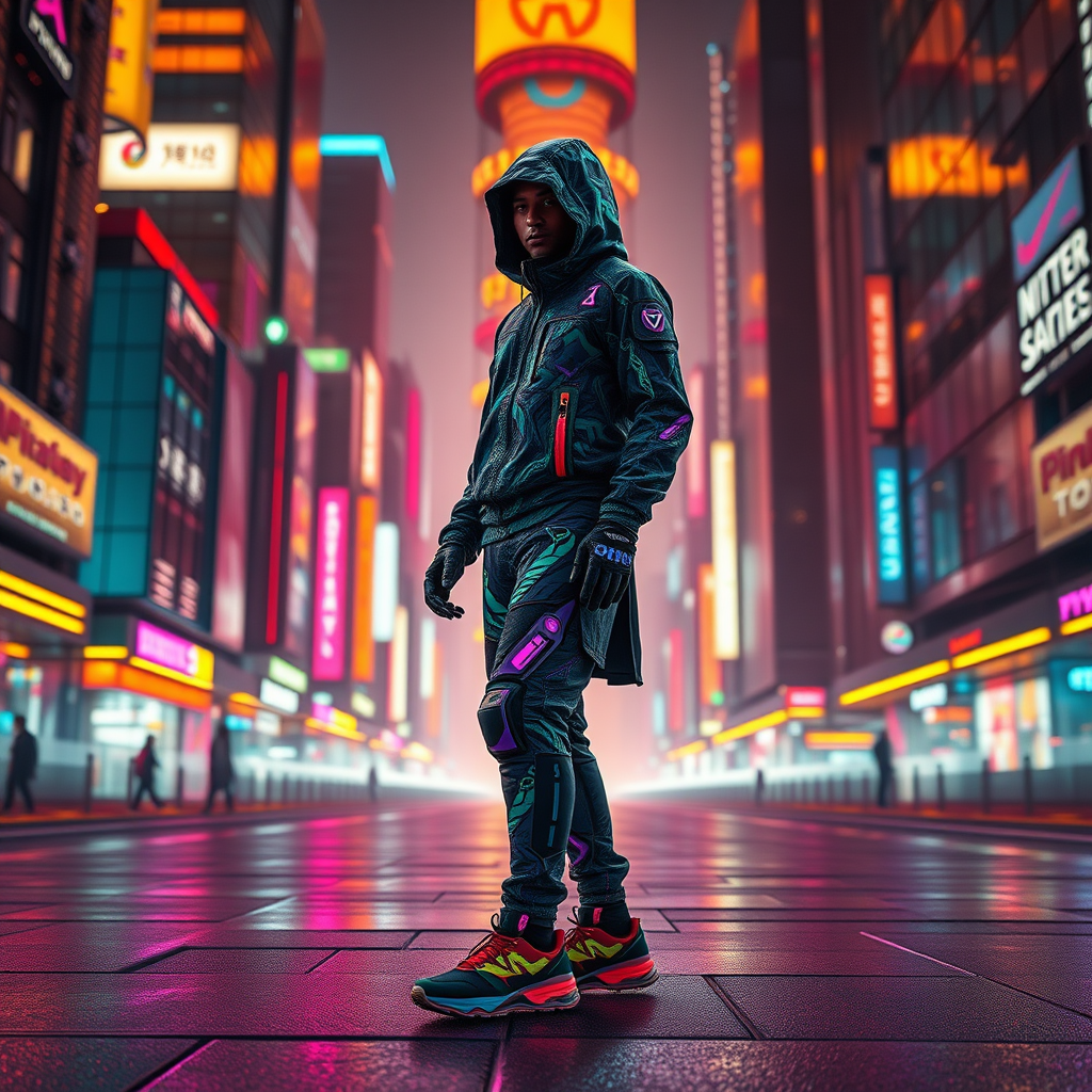 A futuristic figure stands in a vibrant cyberpunk cityscape, dressed in intricately detailed techwear that exudes luxury and elite style. The outfit is a stunning blend of cyberpunk aesthetics and hypermaximalist design, featuring a harmonious balance that echoes the golden ratio. From innovative sneakers to a high-tech hooded jacket, every piece is a testament to the futuristic vision of fashion giants like Errolson Hugh and Yohji Yamamoto. The ensemble is crafted using premium materials, blending textures that highlight both functionality and style. The color palette is vivacious, with electric blues, neon greens, and vivid purples woven through the fabric with intricate patterns. The setting itself enhances the cinematic appeal, capturing a world where technology meets fashion in a seamless dance of form and function. The overall look is a nod to the signature styles of Nike ACG, Y3, and ACRNYM, embodying a avant-garde aesthetic that is both sophisticated and cutting-edge.