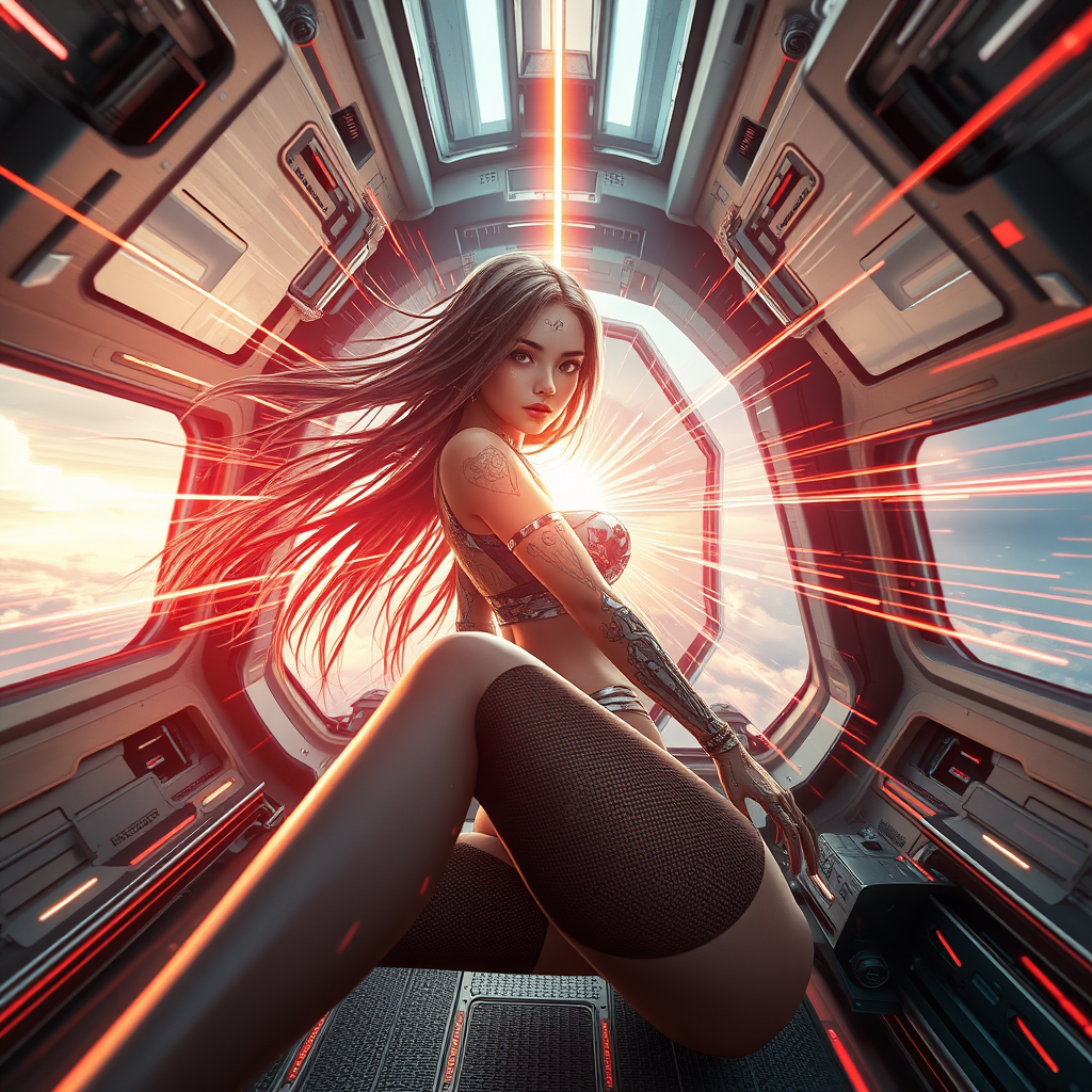 A futuristic girl with cyberpunk enhancements, featuring sleek prosthetics and single stocking, her long hair flowing. Inside a spaceship with advanced design, set in a sci-fi world. The scene is hyper-detailed, with a brilliant laser at the center and beams of light streaking from the sky. Energy clusters vibrate throughout, adding a sense of acceleration and momentum. The environment is depicted with photorealism and hyper-realism, capturing the essence of speed and dynamic motion. It's a cinematic artwork with long exposure effects, rendered in 8K HD super resolution.
