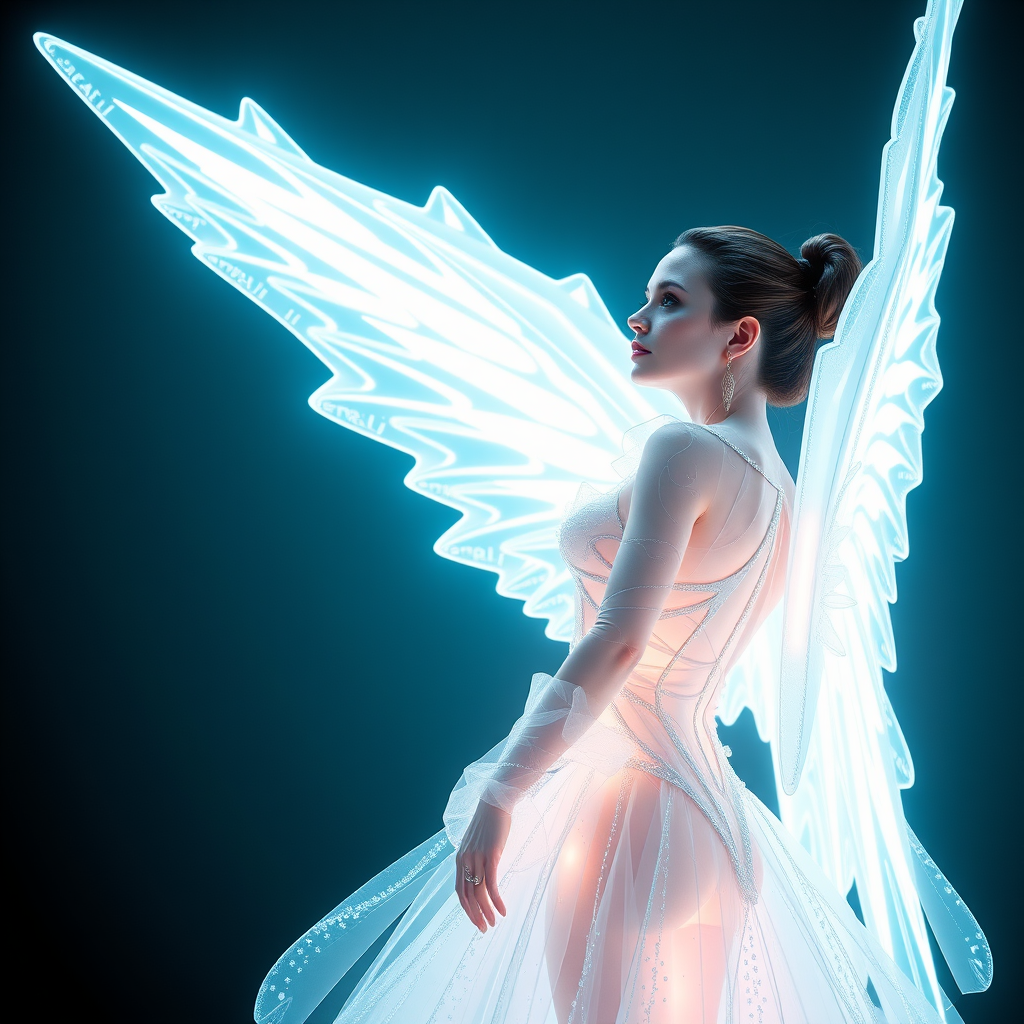 A futuristic glowing gown by Hiveart, captured in an electronic fashion art photoshoot, rendered in Cinema4D style, featuring radiant hues of white and cyan, with abstract anatomy. Inspired by the visionary designs of Syd Mead and the ethereal photography of Anastasiya Dobrovolskaya, showcasing ultrafine detail in stunning 8k 3D resolution --ar 51:91 --s 800 --v 5.1.