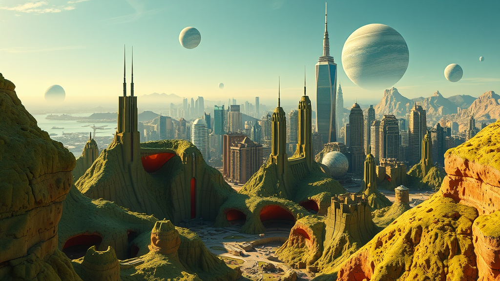 A futuristic green city set against a backdrop of distant otherworldly planets, featuring eroded interiors with vibrant contours of light red and orange hues. The scene merges elements of an Australian landscape, captured with the clarity of a Nikon D750, and incorporates mesmerizing marine vistas. Bathed in natural light, the cityscape exudes hyper-realistic detail with intricate rendering that mimics the granularity of 32k UHD. The composition unfolds as a masterpiece, blending breathtaking realism with creative adaptations of terrestrial and celestial harmony.