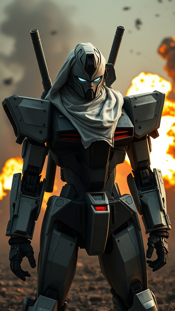 A futuristic gundam counter-terrorist inspired by the world of Counter-Strike, featuring a sleek, armored body with a face obscured by a tattered white sheet, punctuated by void-like holes for eyes. Set against a chaotic warzone backdrop, explosions illuminate the scene in a dramatic cinematic shot, highlighting the intricate design and imposing presence of the RX-78 inspired mech, with subtle modern enhancements. The atmosphere is tense, filled with smoke and debris, capturing the intense energy of a high-stakes battlefield.