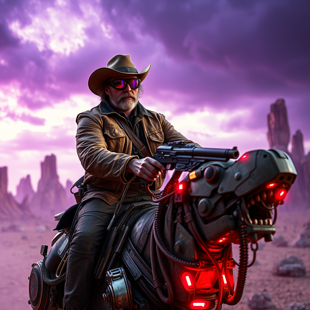A futuristic gunslinger in a weathered leather jacket and augmented reality visor, his cowboy hat casting a shadow over his weathered face, rides a bio-mechanical tauntaun across an otherworldly terrain. Pulsating neon lights reflect off metallic rock formations under a stormy violet sky, as he navigates through the surreal landscape with a determined gaze, captured through a 50mm lens in photorealistic, cinematic lighting, emphasizing the stark contrast between organic and synthetic elements.