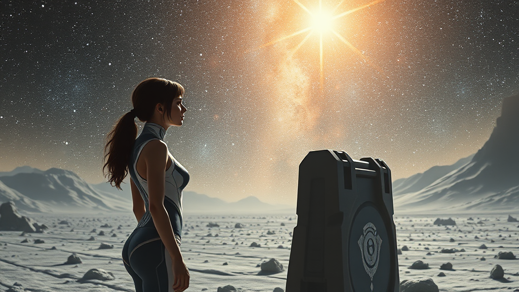 A futuristic heroine gazes into the cosmos, her silhouette framed against the stark landscape of a lunar-like terrain, the curve of her form accentuated by the ethereal glow of distant galaxies.