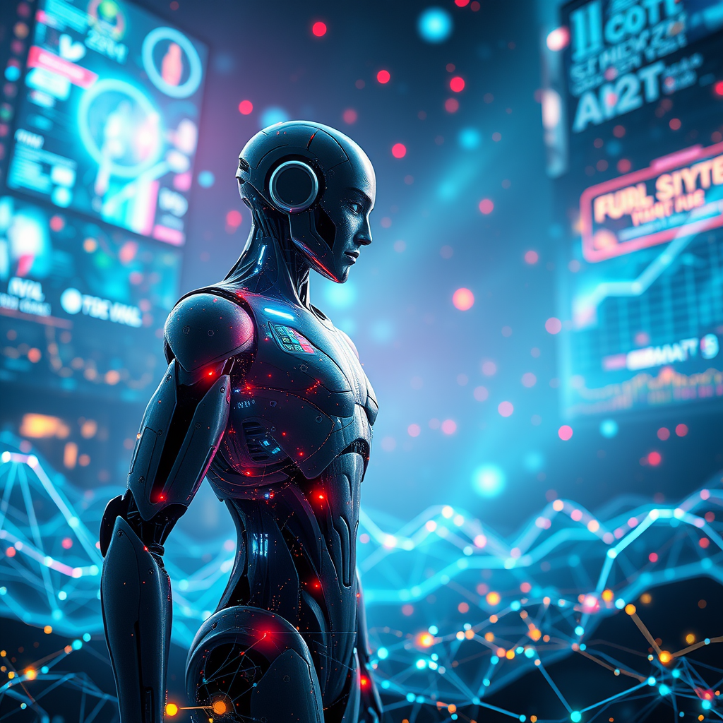 A futuristic humanoid stands amidst a vibrant digital landscape, illuminated by shimmering holograms and pulsating with intricate sound waves. The scene captures the essence of high technology, with neural networks weaving through a tapestry of big data. This professional masterpiece is a reflection of the cutting-edge digital era, presented in stunning 32k UHD resolution. Every detail is captured in high quality, offering a close-up view of a world where humanity and technology are seamlessly intertwined.