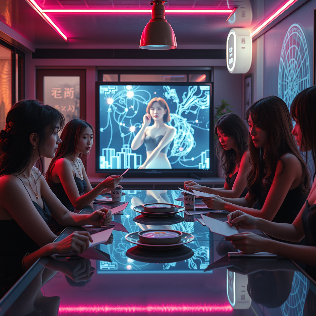 A futuristic Japanese home bathed in neon glows, where stunning young women gather around a sleek dining table, their hands meticulously styled as they pass realistic notes amongst themselves. In the background, a woman is absorbed in a holographic TV projection, creating an ambient symphony of light and sound. This scene, a true masterpiece, captures the essence of a cyberpunk Japan with its blend of tradition and cutting-edge technology.