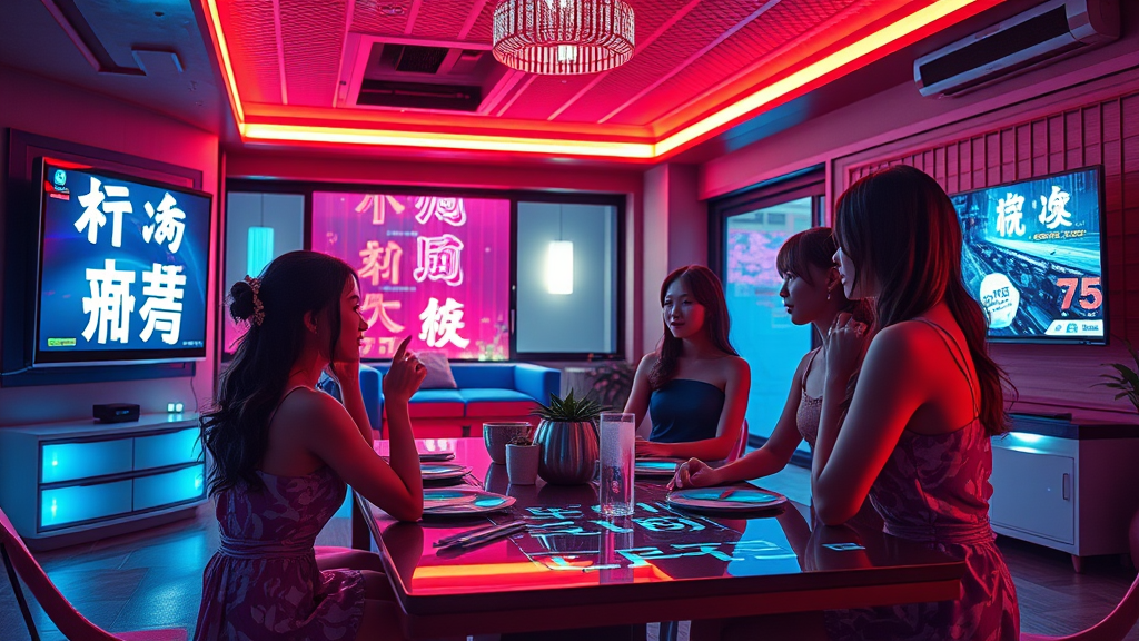 A futuristic Japanese home illuminated by neon lights, with striking young women gathered around a dining table, their hands elegantly poised as they engage in animated conversation. A holographic display projects vibrant kanji characters, adding a touch of authenticity to the setting. One woman glances toward a sleek, wall-mounted screen broadcasting a dynamic, high-tech program. The ambiance is a harmonious blend of traditional Japanese architecture and cutting-edge technology, creating a captivating cyberpunk masterpiece.