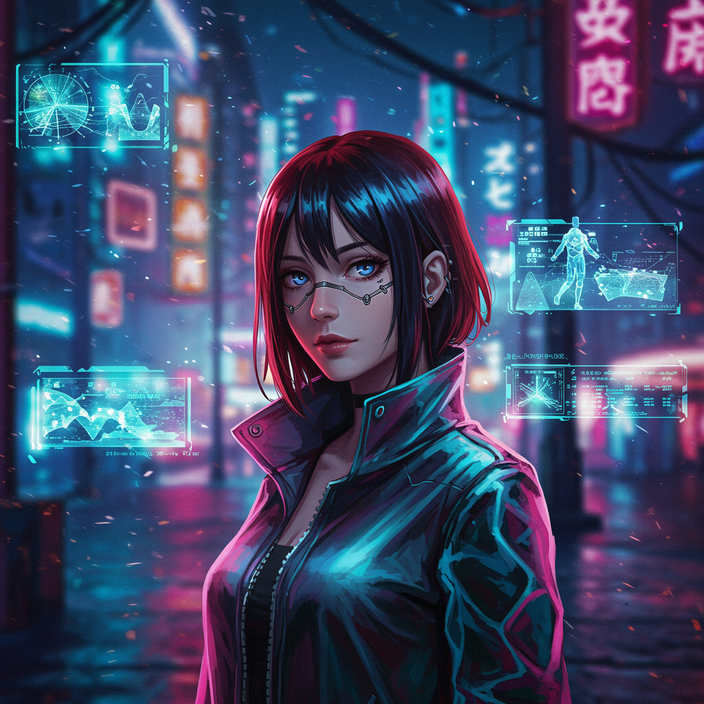 A futuristic Japanese woman in a sleek raincoat stands poised on a bustling city street, rendered in vibrant anime style. Her detailed, symmetric features highlight the meticulous artistry, set against a glowing neon cyberpunk backdrop reminiscent of Cyberpunk 2077. The cityscape is alive with towering holograms and ethereal lights, encapsulating a full-color manga visual essence. This anime key visual style captures the essence of a high-tech world, blending traditional aesthetics with cutting-edge innovation, showcasing the captivating allure of InkPunk768. The woman's eyes, luminous and enigmatic, mirror the city's electric pulse, creating an entrancing fusion of humanity and technology.