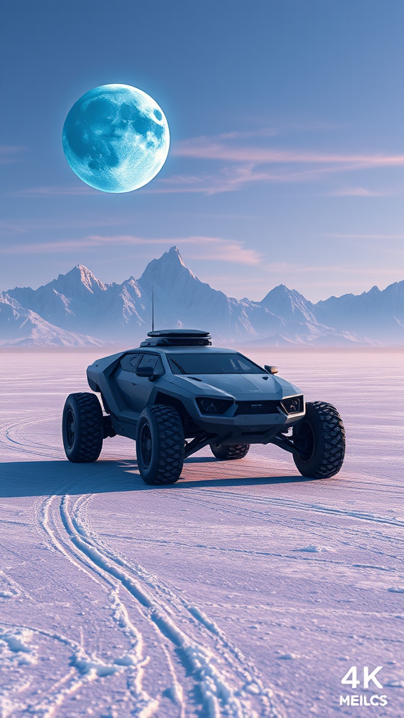 A futuristic light armored vehicle with a sleek, aerodynamic cabin traverses a vast, glistening frozen plain on an alien planet; two ethereal blue moons hang suspended in the sky, casting a surreal glow over the landscape. The vehicle's tires leave delicate tracks in the frost as it moves steadily forward. Behind, jagged alien mountains stretch across the horizon, their icy peaks shimmering in contrast to the vibrant sky. The scene is captured in stunning high detail, offering a photorealistic view that brings the viewer into this otherworldly setting. The influence of Blade Runner is evident in the design, with its blend of advanced technology and a hauntingly beautiful environment, captured in 4k digital art masterpiece quality.