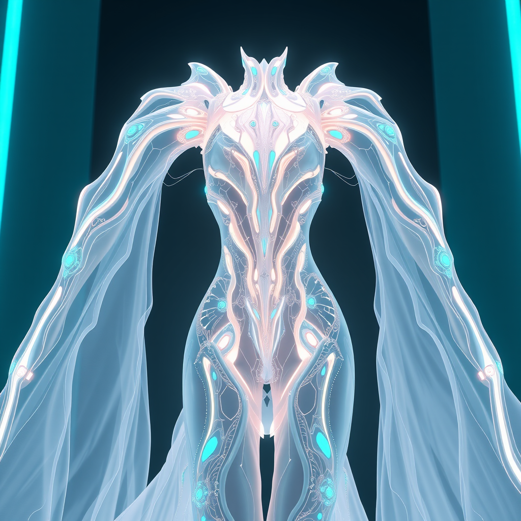 A futuristic luminescent gown by hiveart, showcasing electronic fashion art in a mesmerizing photoshoot, designed in cinema4d style, blending ethereal white and vibrant cyan hues, featuring undefined and abstract anatomy, inspired by the visionary aesthetics of Syd Mead and the intricate detail of Anastasiya Dobrovolskaya, executed in ultrafine 8k 3D resolution --ar 55:85 --s 800 --v 5.2.