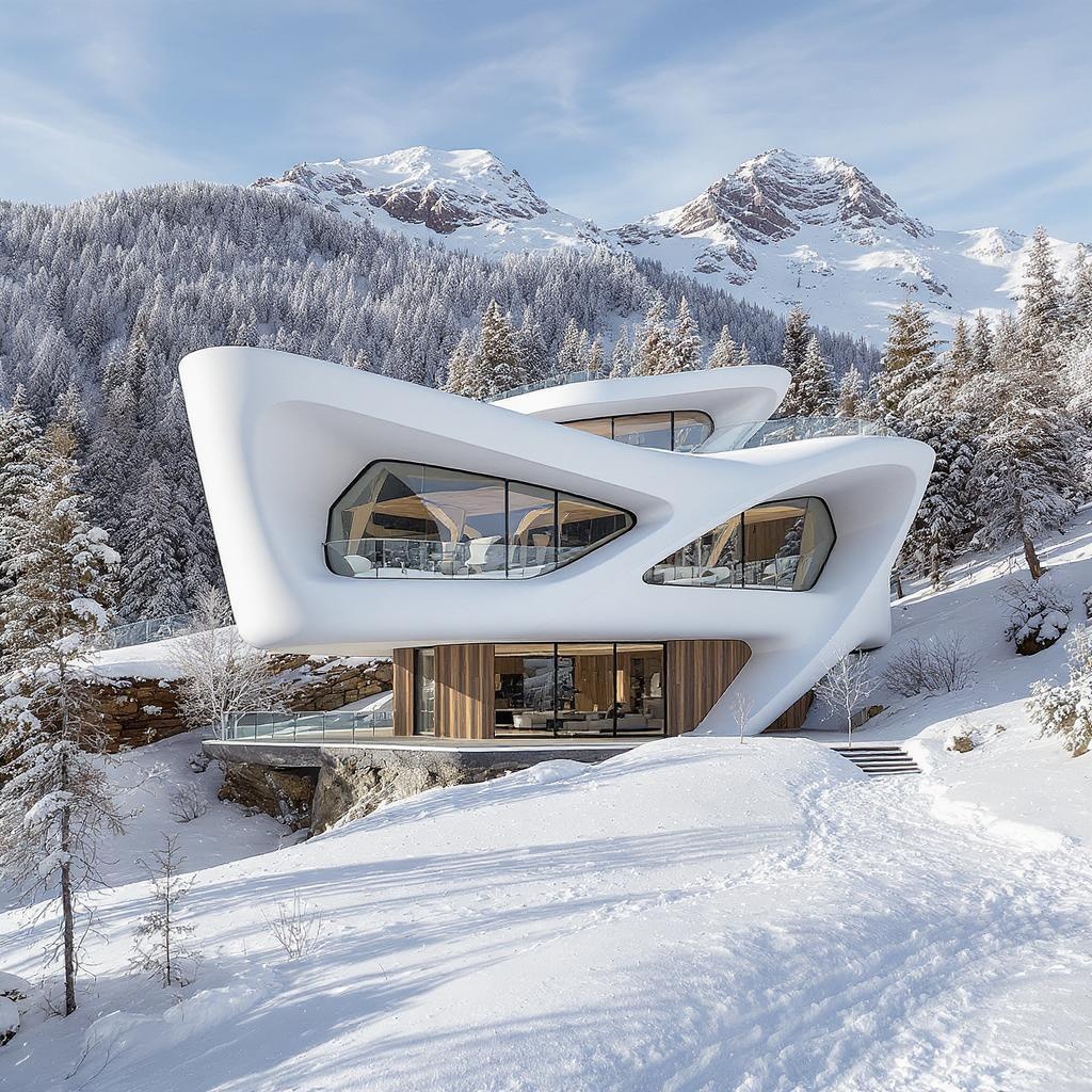A futuristic luxury Swiss mountain retreat with sleek white walls and striking triangular windows, characterized by its innovative curved architecture amidst snowy landscapes and pine forests. This modern haven combines the warmth of wood and the solidity of concrete, boasting expansive glass walls and minimalist design. The open-plan living spaces are complemented by a stunning rooftop terrace offering panoramic mountain vistas. Inspired by the visionary styles of Bjarke Ingels, Zaha Hadid, and Frank Gehry, the house features clean lines and a sharp attention to detail, creating an extraordinary blend of nature and cutting-edge design.