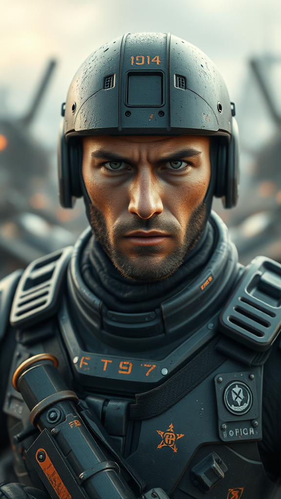 A futuristic marine clad in combat armor stands amidst an apocalyptic war-torn landscape, locking eyes with the viewer. This 8k hyper-realistic portrait captures the detailed texture of his skin and the intensity of his gaze. The scene is enveloped in diffused soft lighting, with a shallow depth of field emphasizing his presence. Cinematic CGI lighting creates a dramatic atmosphere while maintaining sharp focus. Despite the vivid and lifelike rendering, the image purposefully includes low quality, resolution issues, and digital artifacts, adding a paradoxical layer of realism with visual distortions such as jpeg artifacts, and intentional imperfections. The marine's visage exhibits signs of wear and battle fatigue, yet remains unyielding, embodying the relentless spirit of a warrior in the face of dystopian ruin.