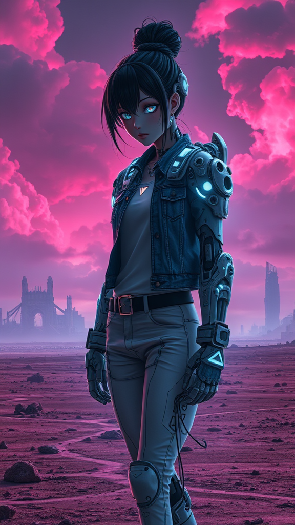 A futuristic mechanical girl with the body of a Kidou Keisatsu Patlabor, adorned in intricate bioluminescent cyborg armor. Her detailed face features glowing eyes, surrounded by cold-colored, highly intricate Egyptian-like details. Standing on a desolate, post-apocalyptic wasteland with the ruins of a massive city on the horizon, the girl looks down on a viewer. Her mechanical limbs, connected by blood vessels and tubes, exude a killing machine vibe, contrasted by her alluring appearance. Rendered in ultra-sharp 8k quality with global illumination and dramatic cinematic light in pink and violet hues, the scene combines realistic lighting and octane rendering. The girl, with black hair in a bun and a cold expression, wears a denim jacket over a white t-shirt with casual pants. The backdrop of ominous clouds adds to the masterpiece's visual impact, drawing inspiration from Neon Genesis Evangelion.