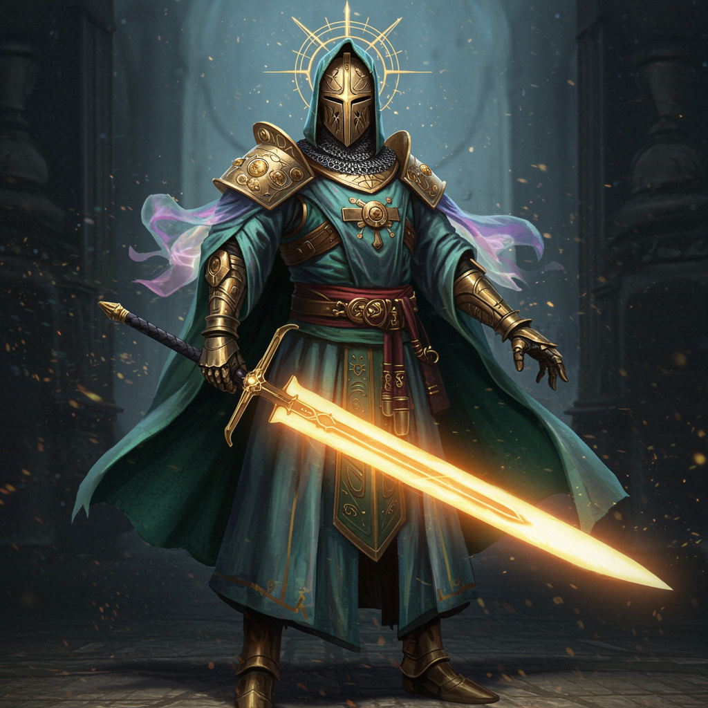A futuristic medieval knight clad in intricately designed cybernetic armor, adorned with elaborate robes that shimmer with ethereal patterns. The knight stands poised, gripping a radiant energy weapon that pulses with an otherworldly glow. Their eyes, piercing and intense, reflect a fusion of ancient wisdom and cutting-edge technology. The setting is a stunning sci-fi landscape, where the medieval past seamlessly intertwines with the futuristic realm. The atmosphere is cinematic, capturing a moment of profound heroism and mystic allure.