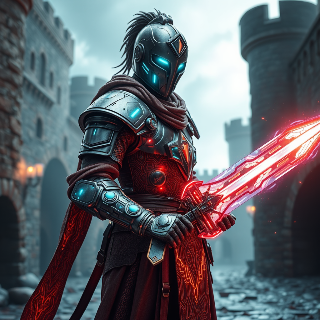 A futuristic medieval knight enhanced with cybernetic features, dressed in intricately designed robes that seamlessly blend ancient patterns with neon circuitry, wielding a glowing energy-infused weapon. The scene is set in a high-tech world where rustic stone castles meet advanced technology, creating a photorealistic and cinematic atmosphere. His armor, glistening with electronic elements, reflects the union of past and future. The environment is rich with dynamic lighting and a sense of mystic energy, capturing a bold juxtaposition of medieval and sci-fi aesthetics.