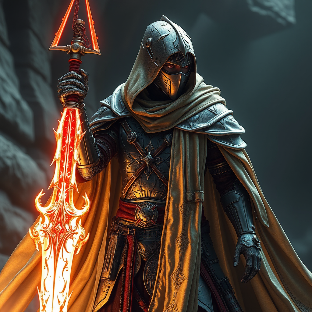 A futuristic medieval knight infused with cybernetic enhancements, draped in intricate, flowing robes that shimmer with a metallic sheen, wielding a radiant weapon that pulses with an ethereal glow, blending elements of magic and technology in a sci-fi setting, captured in a photorealistic, cinematic style with vibrant colors and intricate details.