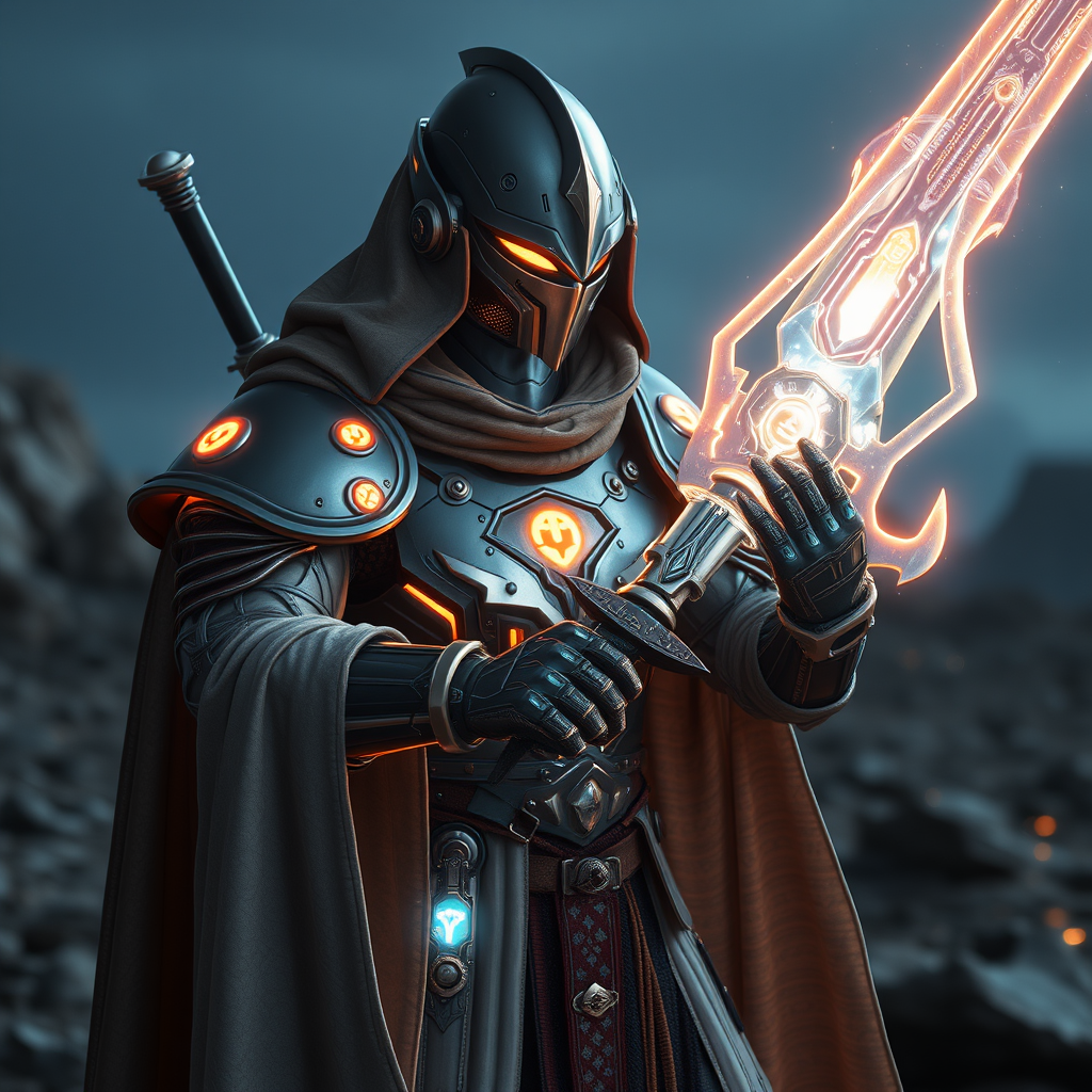 A futuristic medieval knight with cybernetic enhancements, clad in intricately designed robes that seamlessly blend classical elegance with advanced technology, featuring an array of glowing sigils. The knight wields a luminous weapon that pulsates with energy, casting dynamic shadows in a sci-fi environment. The cinematic scene captures both the intricate details of the armor and the radiant glow of the weapon, set against a backdrop of a futuristic landscape.