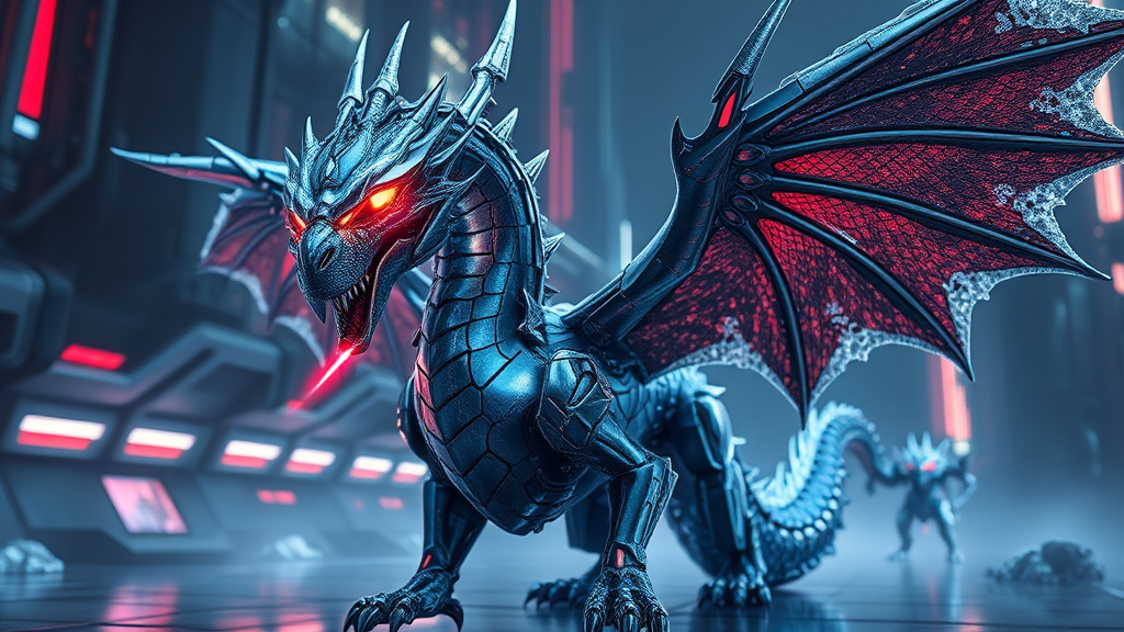 A futuristic metal dragon with glowing fury eyes stands in a sci-fi environment, its full body rendered in hyper-detail. Neon lights reflect off its scales, while its wings exhibit a mesmerizing blend of ice and metal effects. The dragon's eyes beam with intensity, and laser-like accents enhance its formidable presence. The scene captures the essence of a realistic, intricately designed creature in a high-resolution, 4k composition, set against a backdrop of sleek, futuristic structures.