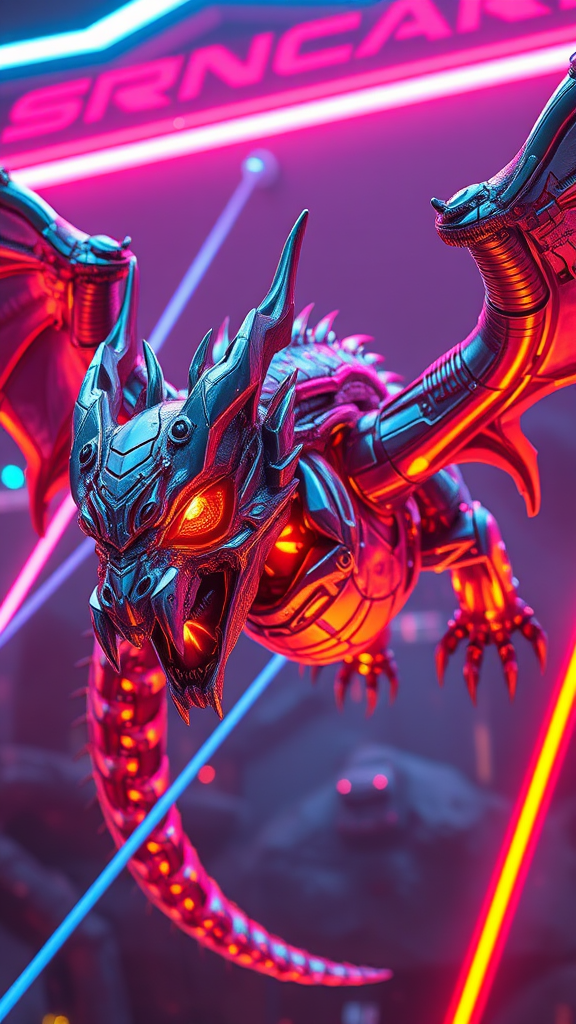 A futuristic metal dragon with hyper-detailed features glides through a sci-fi environment, its fury-filled eyes glowing with intensity. Neon lights reflect off its sleek, metallic body, casting a vibrant, otherworldly glow. Its full body is a marvel of engineering, with ice and metal effect wings that shimmer under the ambient light. Lasers flicker around its form, enhancing the dragon's menacing presence. The scene is set in a 4k super resolution, capturing every intricate detail in stunning clarity, embodying a fusion of advanced technology and mythical power in a futuristic style.