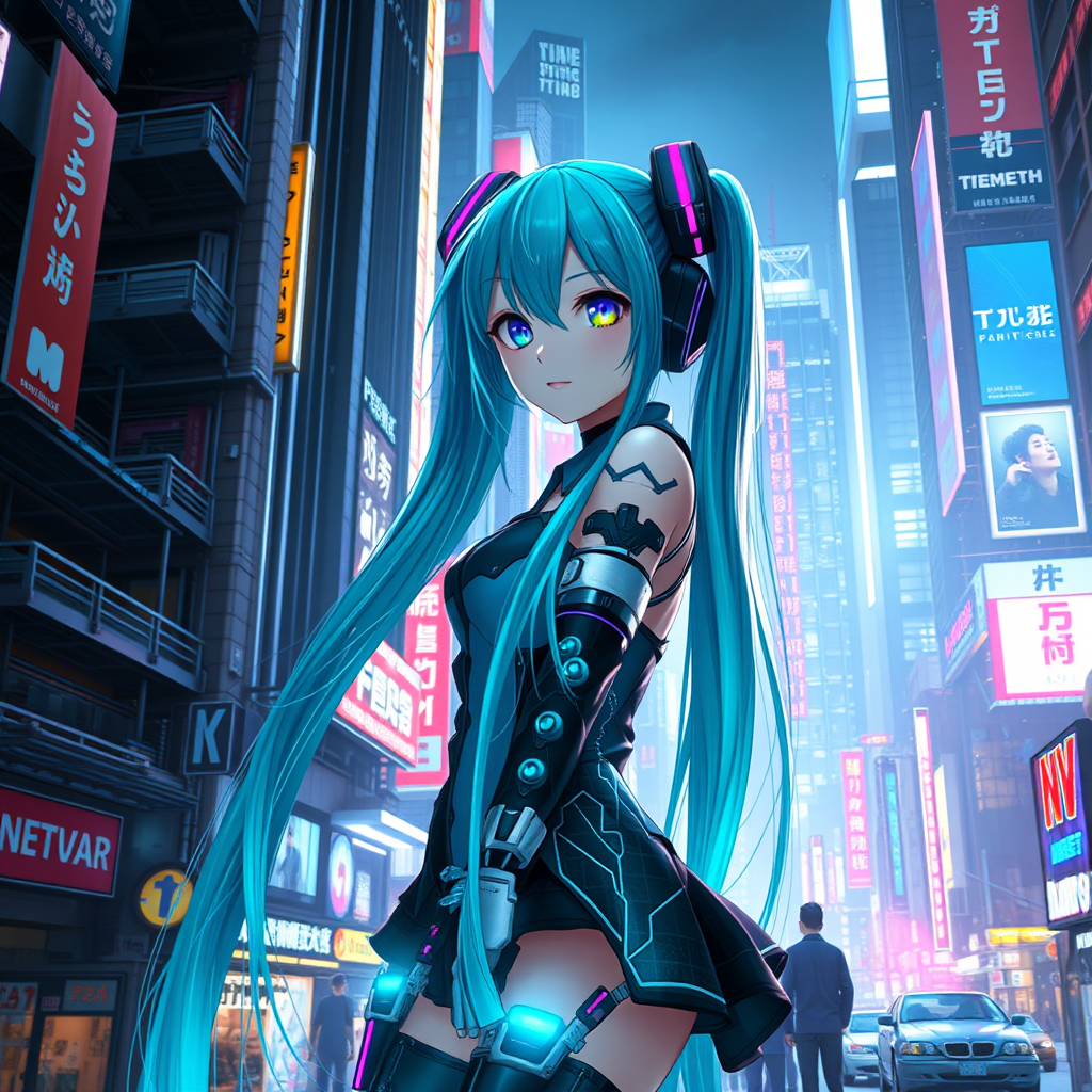 A futuristic metropolis bathed in neon lights and towering skyscrapers, where Hatsune Miku, reimagined as a digital diva with enhanced cybernetic features, navigates the underbelly of the city as a holographic icon. Her long teal hair now shimmers with LED lights, reflecting the pulsating rhythm of a virtual world. Miku, with her voice modulated to perfection, embodies the spirit of rebellion and hope, her songs resonating through the gritty streets and high-tech clubs, uniting a diverse community of hackers, cyborgs, and dreamers seeking freedom from corporate control in a hyper-connected society.