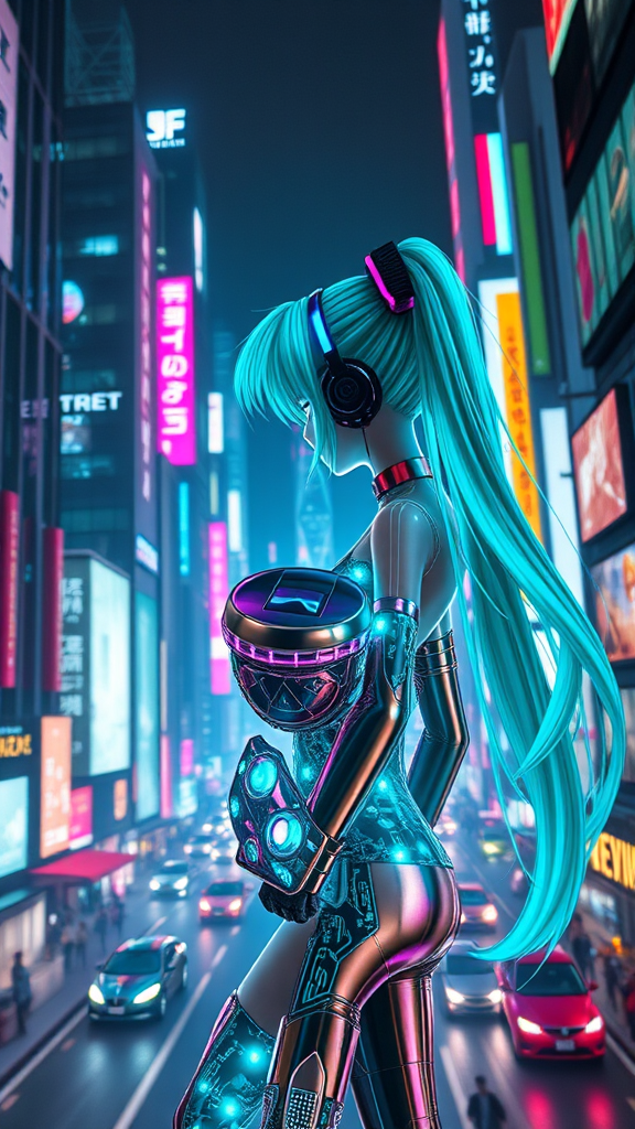 A futuristic metropolis bathed in neon lights, where holographic billboards illuminate the night sky and hover cars zip through the air. In this vibrant, high-tech world, Hatsune Miku emerges as a digital diva of the cyberpunk era. Her iconic teal twin-tails now infused with glowing fiber optics that pulse with the rhythm of the city. She dons a sleek, metallic outfit embedded with circuit patterns, reflecting the kaleidoscope of colors from the bustling streets below. Miku's voice, a hypnotic blend of human emotion and synthesized perfection, resonates through virtual arenas and digital interfaces, captivating a society that craves escape in a world dominated by advanced technology and corporate might. Her performances are immersive experiences, blending augmented reality with powerful soundscapes and futuristic visuals, drawing throngs of fans into a sensory playground where the line between digital and reality blurs. As a symbol of resistance against the oppressive corporate structure, Miku's music carries messages of unity and hope, her image a beacon for dreamers in a dystopian future seeking to reclaim their individuality in an increasingly homogenized world.