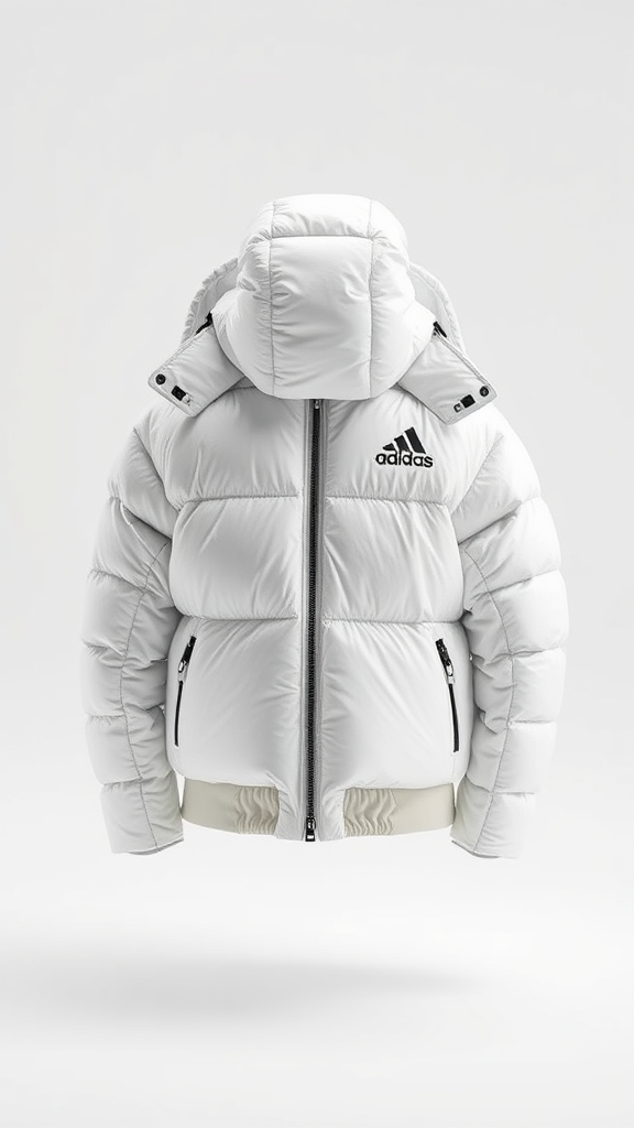 A futuristic milky Adidas winter puffer jacket designed by Kanye West, showcasing a cutting-edge design trend with intricate, detailed textures. Set against a pristine white background, the jacket embodies a sleek and modern aesthetic captured in 4K resolution, emphasizing high-definition detail and clarity.