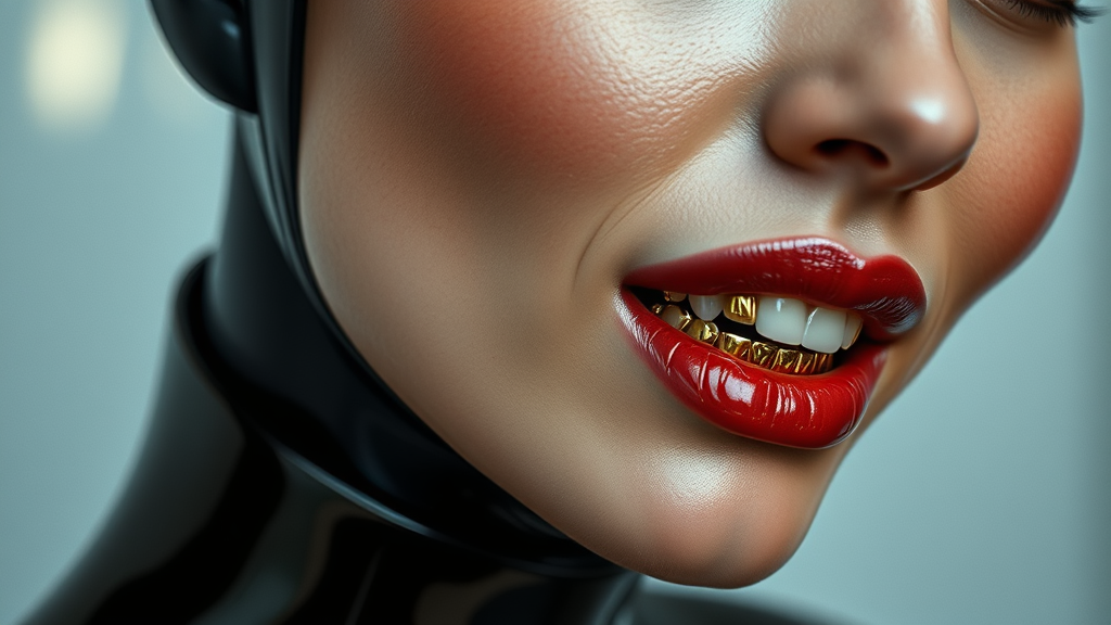 A futuristic minimalist depiction of a woman with a pronounced jawline and shimmering gold teeth, blending elements of dark romanticism with the structured elegance reminiscent of the Bechers' typologies. The image features a glossy finish and intricate details, capturing intimate close-up shots. The setting exudes a restrained yet bold aesthetic, where sleek, polished forms meet a subtly elaborate and modern design.