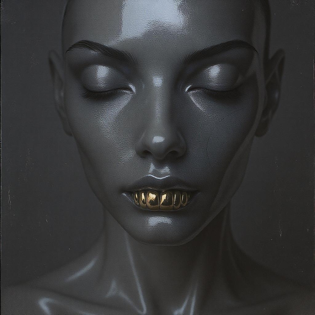 A futuristic minimalist portrait of a woman featuring a prominent jawline and shimmering gold teeth, blending restrained forms with elements of dark romanticism. Inspired by the Bechers' typologies, this piece incorporates a glossy finish and intricate imagery, focusing on close-up details that reveal the unique textures and subtle contrasts. The composition maintains an artful balance, embracing raw style with soft, muted tones and reflective surfaces, capturing a sense of elegance and strength in the stark simplicity of the moment.