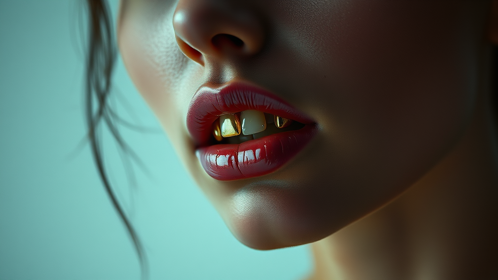 A futuristic minimalist portrait of a woman showcasing a prominent jawline and gleaming gold teeth. The scene embodies dark romanticism with restrained forms, capturing a Becher-inspired typological essence. The focus is on a glossy finish, revealing intricate details in close-up. The atmosphere is subtly moody, with a blend of elemental simplicity and complex imagery that draws the viewer into the captivating allure of her unique features.
