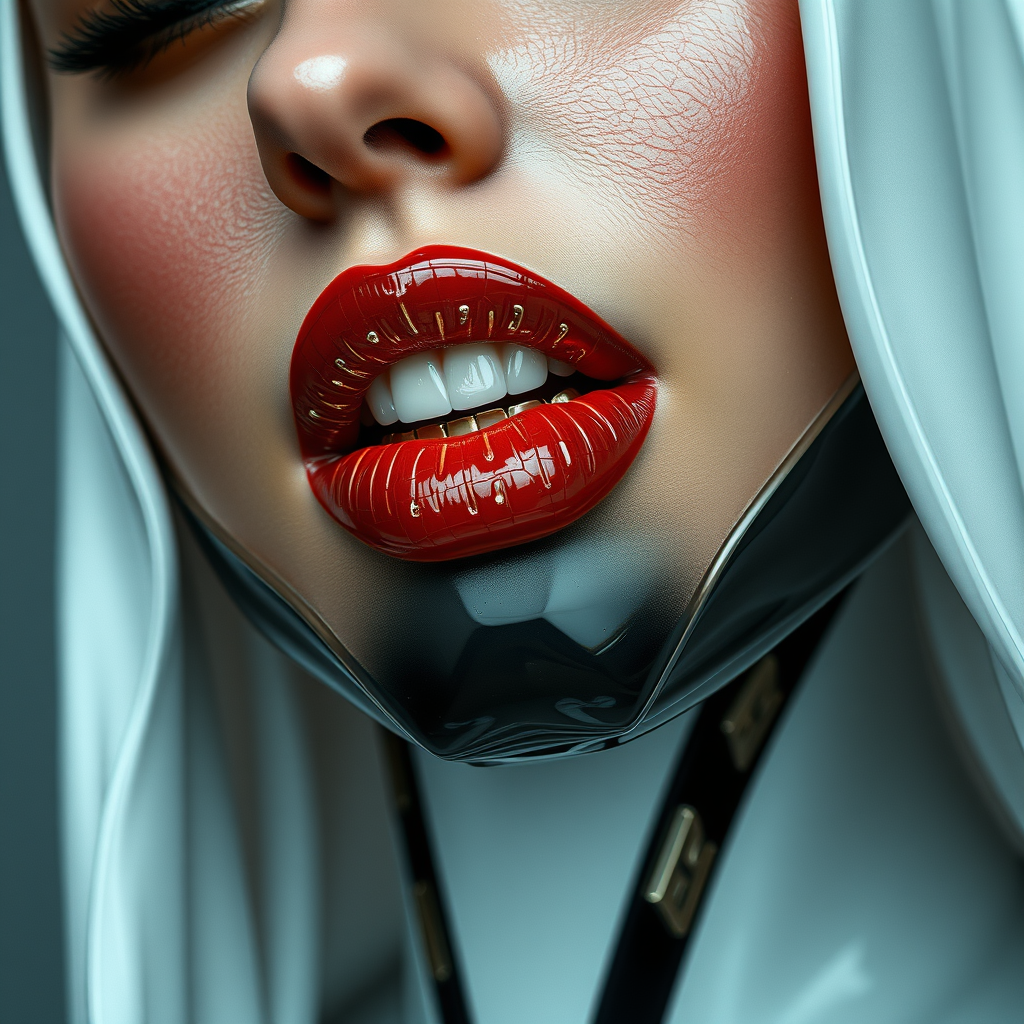 A futuristic minimalist portrait of a woman with a prominent jaw and shimmering gold teeth, styled with restrained forms and dark romantic undertones. Drawing inspiration from the Bechers' typologies, the image showcases a glossy finish and intricate details, captured in close-up shots. The aesthetic blends sleek modernity with a touch of gothic allure, emphasizing the contrast between smooth surfaces and complex textures. The composition remains uncluttered yet richly layered, offering a striking visual narrative.