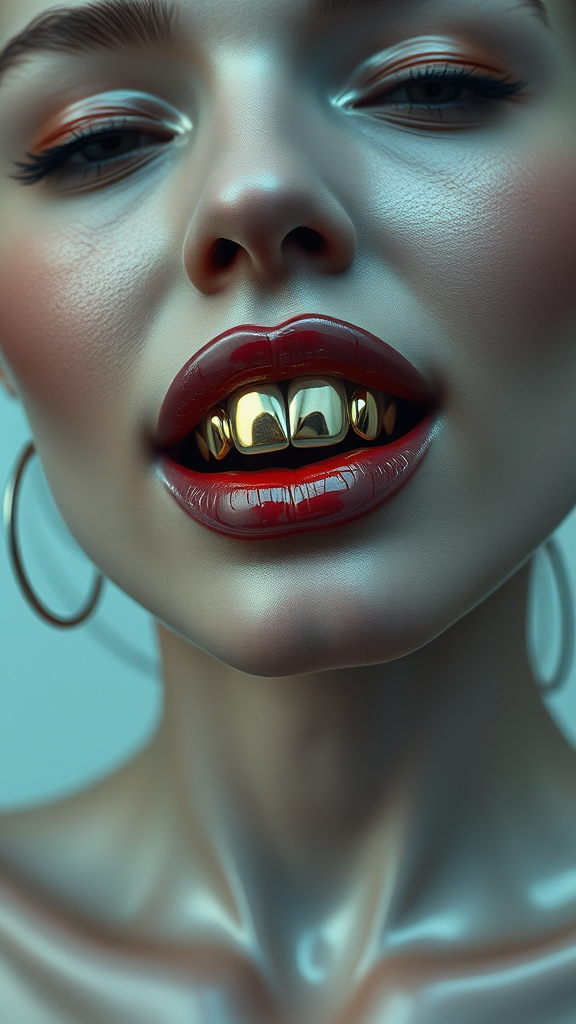 A futuristic minimalist portrayal of a woman with a pronounced jawline and gleaming gold teeth, embodying dark romanticism, influenced by the Bechers' typologies. Distinctive restrained forms with a glossy finish, featuring intricate imagery in close-up shots. The focus is on her unique facial structure, emphasizing the contrast between the metallic sheen of her teeth and the smooth, polished texture of her skin, set against a subtly futuristic background.