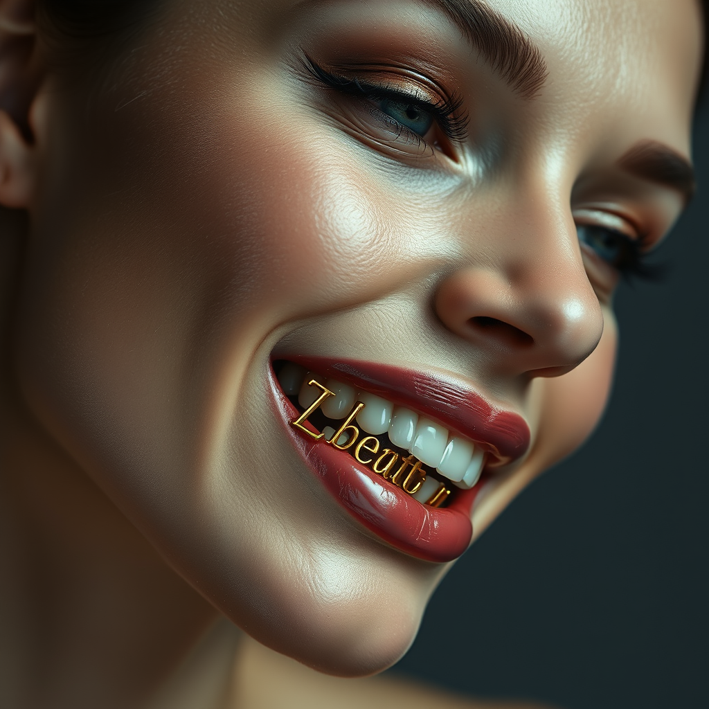 A futuristic minimalist portrayal of a woman with a pronounced jawline and shimmering gold teeth, blending dark romanticism with a typological approach. The composition highlights glossy finishes and intricate imagery through close-up perspectives, emphasizing restrained forms and subtle elegance, set against a nuanced and moody backdrop.