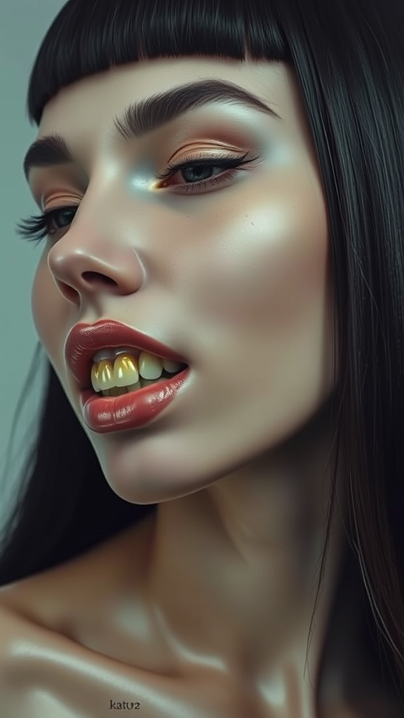 A futuristic minimalist portrayal of a woman with a prominent jaw and gleaming gold teeth, captured in darkly romantic tones reminiscent of The Bechers' typologies. The imagery showcases restrained yet intricate forms, with a glossy finish that highlights every detail. The piece focuses on close-up, emphasizing the contrast between her striking features and the smooth, minimalist background. The composition breathes life into the tension between simplicity and complexity, creating a visually compelling portrait that is both timeless and avant-garde.
