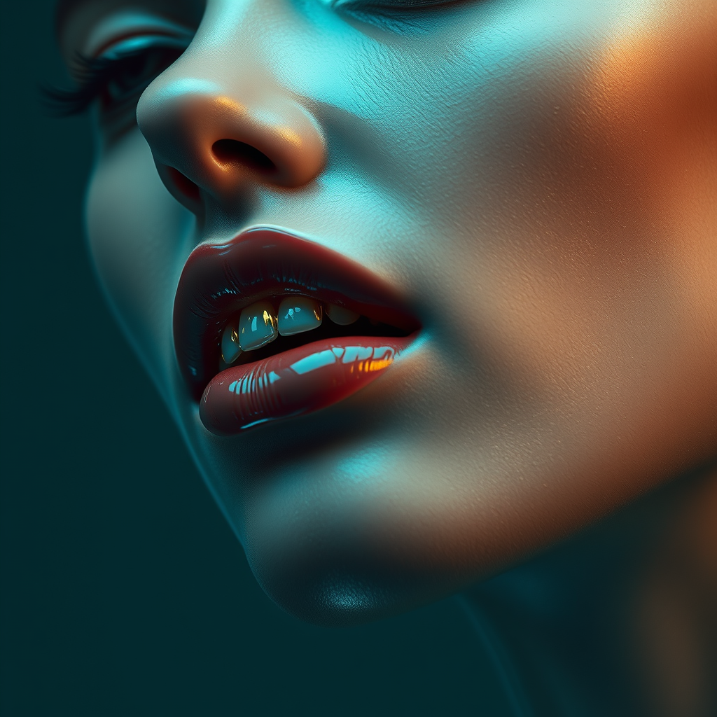 A futuristic minimalist portrayal of a woman with a prominent jaw and shimmering gold teeth, embodying dark romanticism with refined, restrained forms. The composition draws inspiration from the Bechers' typologies, featuring a glossy finish and intricate details. A close-up perspective captures the essence of the subject, highlighting her unique allure. The scene is set in a moody, sophisticated ambiance, inviting the viewer to appreciate the subtle interplay of light and shadow.