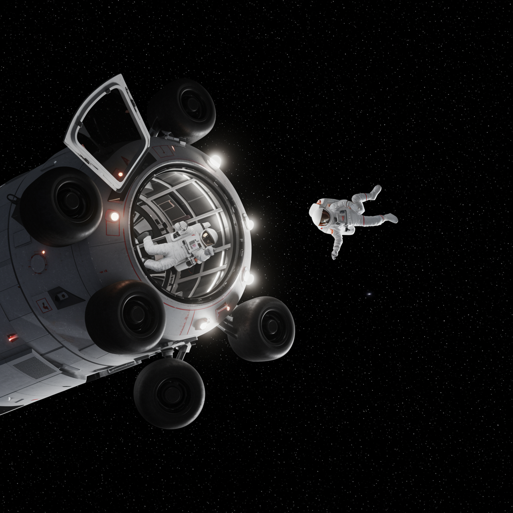 A futuristic, minimalist scene reminiscent of an 80s movie still, featuring two astronauts suspended in zero gravity inside a spacecraft. The view is from above, highlighting an open circular hatch on one side, surrounded by prominent black wheels and glowing lights. The setting is framed against the vast, starry night sky, evoking the sublime expanse of space. Inspired by John Berkey, the image captures a sense of awe and exploration with subtle creative touches that enhance the nostalgic yet forward-looking atmosphere.