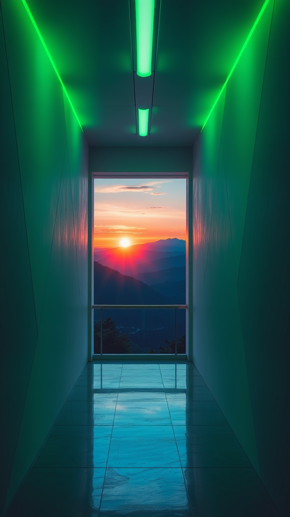 A futuristic passageway with neon green lighting, featuring geometric white walls, offering a framed view of a mountain vista as the sun sets, casting dramatic silhouettes. The scene contrasts light and shadow, enhancing the sci-fi ambiance in an architectural photograph. With a dramatic perspective, cool blue mountains stretch across the horizon, adding depth to the composition.