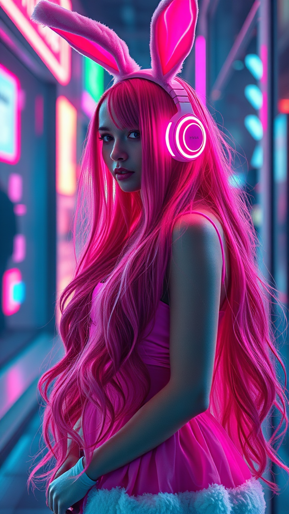 A futuristic pink Santa Claus girl in the cyber world exudes cyberpunk vibes with her stunning long hair cascading over a pink skirt. She sports playful pink bunny ears and sleek pink headphones that pulse with neon lights, encapsulating a sense of a vibrant technological future. Captured with a Phase One XT IQ4 150MP camera, the photograph emphasizes low exposure and high contrast, utilizing an ISO of 50 and shot with an 80mm prime lens. The scene is alive with the electric glow of neon reflections, highlighting her as a digital icon in this cyber landscape.