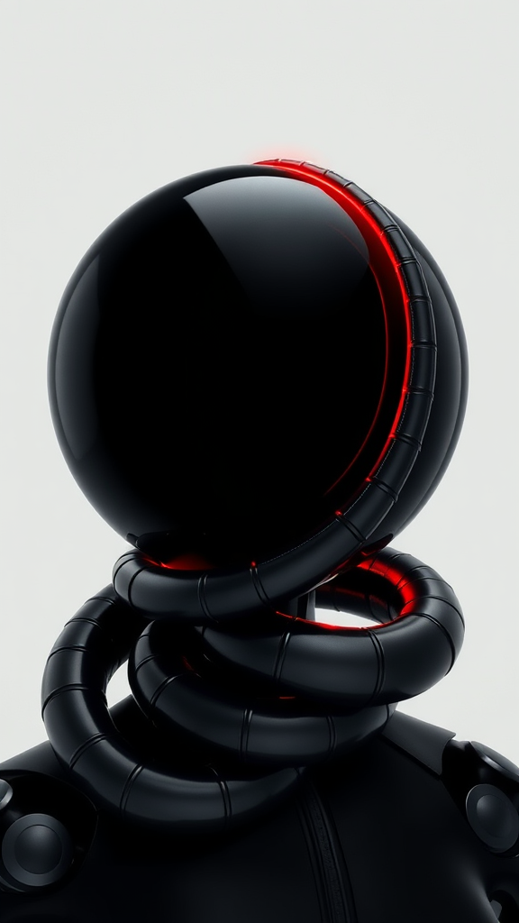 A futuristic portrait featuring a glossy black sphere intertwined with a metallic worm, emanating a subtle glowing red hue. The artwork captures the essence of a conceptual futuristic landscape, with elements inspired by Elina Karimova's aesthetic style. It showcases oversized rubber-like robotic figures, set against a light black background, emphasizing advanced technology and innovation. This vision presents an art piece that transcends traditional forms, exploring the dynamic interplay between technology and organic materials, while maintaining a raw and unfiltered style.