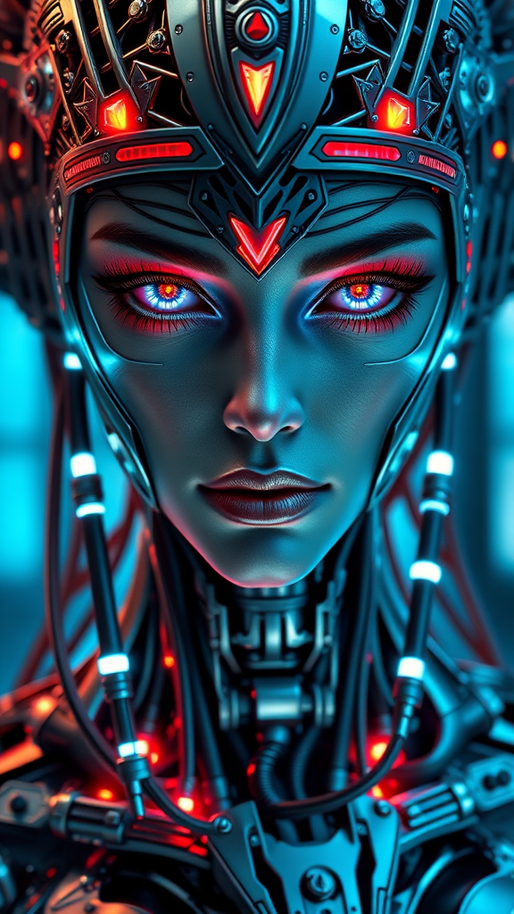 A futuristic portrait of a mechanical Supergirl featuring a detailed face with cold and intricate Egyptian-inspired metal ornaments. Global illumination and realistic lighting enhance the ultra-sharp 8k octane render. Her neon glowing eyes face the camera, with mechanical limbs and cervical connections visible. Blood vessels merge with tubes, and wires connect to her head. The design incorporates neon details amidst the intricate machinery, blending elements of human and mechanical identity. The artwork captures a sense of realism and depth, embodying a futuristic charm that resonates with modern digital art trends.