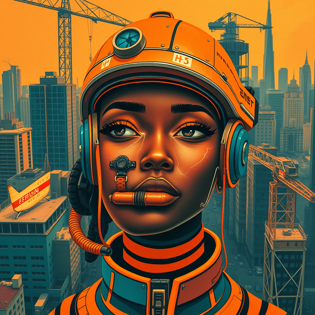 A futuristic portrayal of a female face in the vibrant style of Afrofuturism, drawing inspiration from George Callaghan's dynamic work. The composition blends elements of engineering, construction, and design, set against the backdrop of a bustling urban landscape. The scene is awash with rich hues of dark cyan and vivid orange, emphasizing contrast and cultural depth. Designed in the compelling aesthetic of poster art, the image exudes a sense of innovation and progress, capturing the essence of urban life.