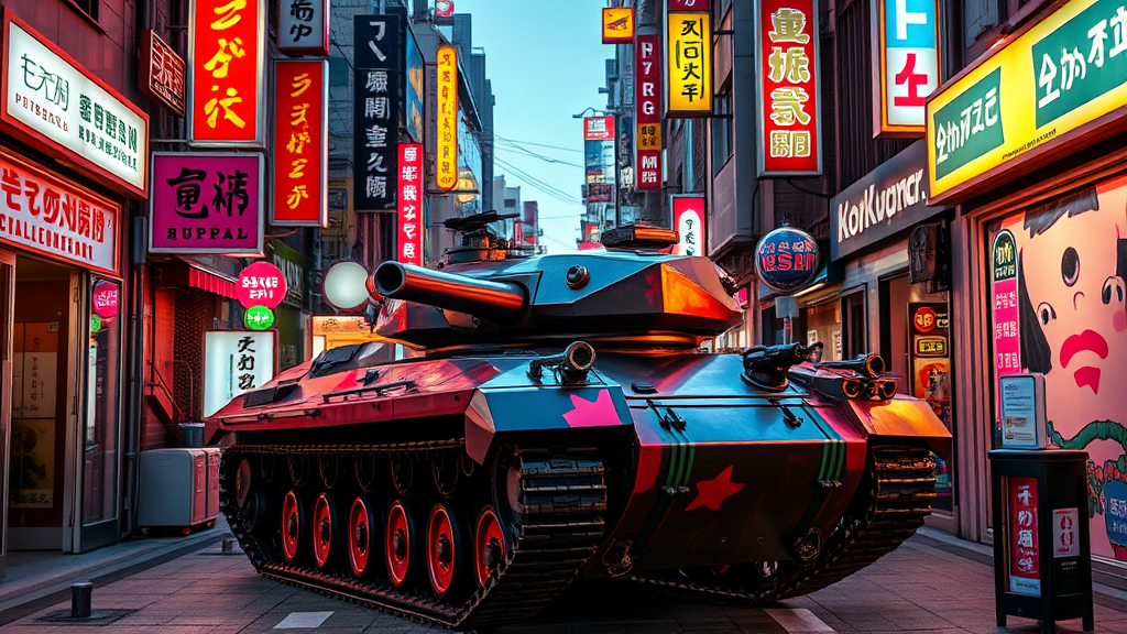 a futuristic punk-themed military tank navigating the narrow alleyways of a bustling Japanese metropolis, neon signs casting vibrant reflections on its metallic surface