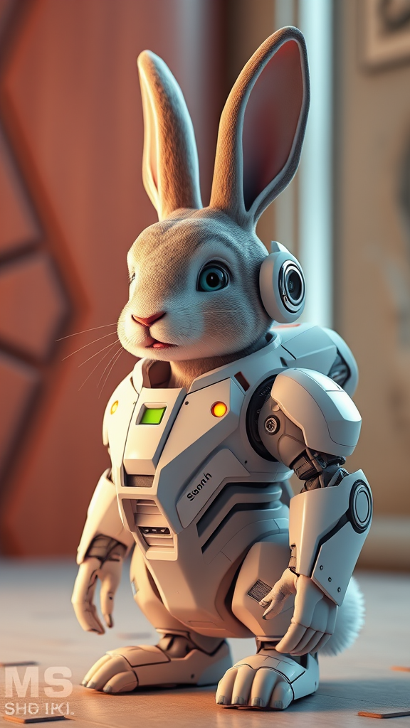 A futuristic rabbit adorned in a sleek mech suit, designed with Pixar-style aesthetics, featuring a pastel color palette. The scene is illuminated with natural, realistic lighting and shading, showcasing high-quality, ultra-detailed textures. Rendered in 3D using C4D and octane render, the image employs ray tracing techniques for depth and realism, producing an 8k resolution. The mech design is characterized by smooth, aerodynamic lines and intricate details, harmoniously blending organic forms with advanced technology.